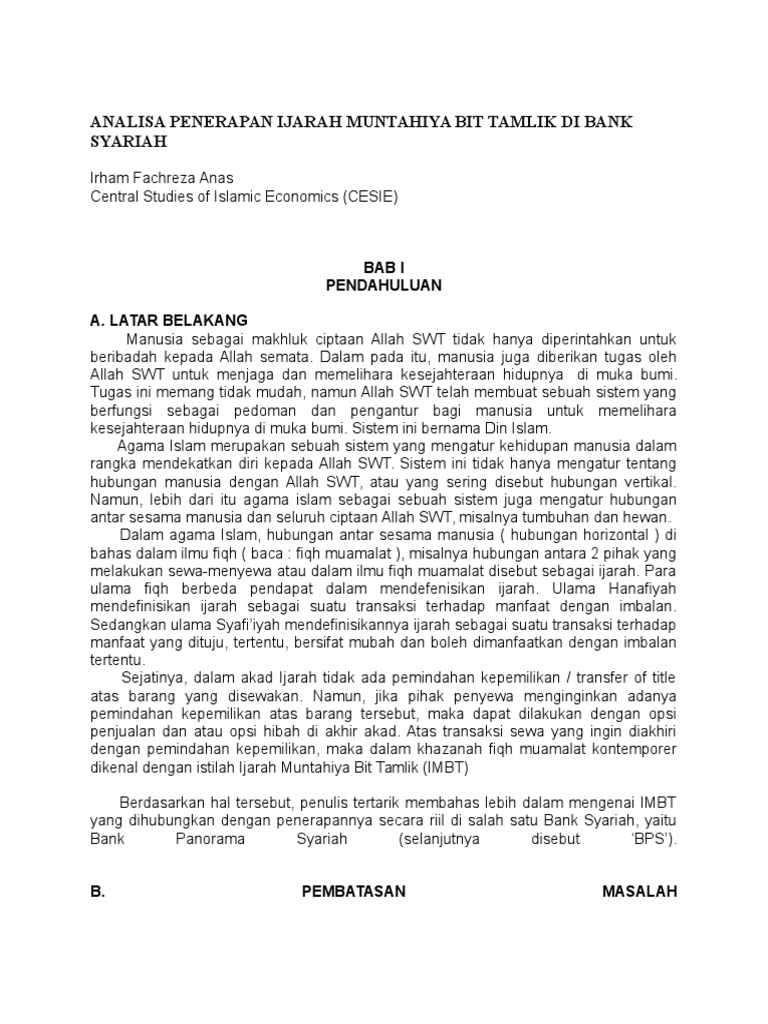 Ijarah muntahiyah bittamlik dan aplikasinya di bank syariah. ypacome.blogspot.com › 2021/12/43-ijarah43 ijarah muntahiyah bittamlik dan aplikasinya di bank ... Dec 22, 2021 · Bank syariah dan nasabah melakukan perjanjian dengan akad ijarah muntahiya bittamlik.Dalam akad di jelaskan tentang objek sewa, jangka waktu sewa, dan imbalan yang di berikan oleh lessee kepada lessor, hak opsi lessee setelah akad sewa berakhir dan ketentuan lainnya. › 30536080 › IMPLEMENTASI_AKADIMPLEMENTASI AKAD IJARAH MUNTAHIYAH BITTAMLIK DI BANK SYARIAH ... IMPLEMENTASI AKAD IJARAH MUNTAHIYAH BITTAMLIK DI BANK SYARIAH Ijara contract implementation Muntahia bittamlik in Islamic bank Makalah Diajukan Untuk Tugas Bahasa Indonesia Dosen Pengampu : Zein Muttaqien, S.E.I., M.A. Disusun oleh : Abdul Razaq Salafudin : 14423014 Muhamad Ar-Rasyied : 14423062 PROGRAM STUDI EKONOMI ISLAM FAKULTAS ILMU AGAMA ISLAM UNVERSITAS ISLAM INDONESIA YOGYAKARTA 2016 ... › ijarah-muntahiyah-bit-tamlikIjarah Muntahiyah Bit Tamlik | Bank Jatim Ijarah Muntahiyah Bit Tamlik. Memberikan fasilitas kepada nasabah yang membutuhkan manfaat atas barang (sewa) dengan pembayaran tangguh, dengan opsi memiliki dikemudian hari. Objek Sewa : Properti (rumah, ruko, gudang, rukan, rusun); Peralatan/Appliances (peralatan medis, peralatan industri/pabrik, mesin industri/pabrik);