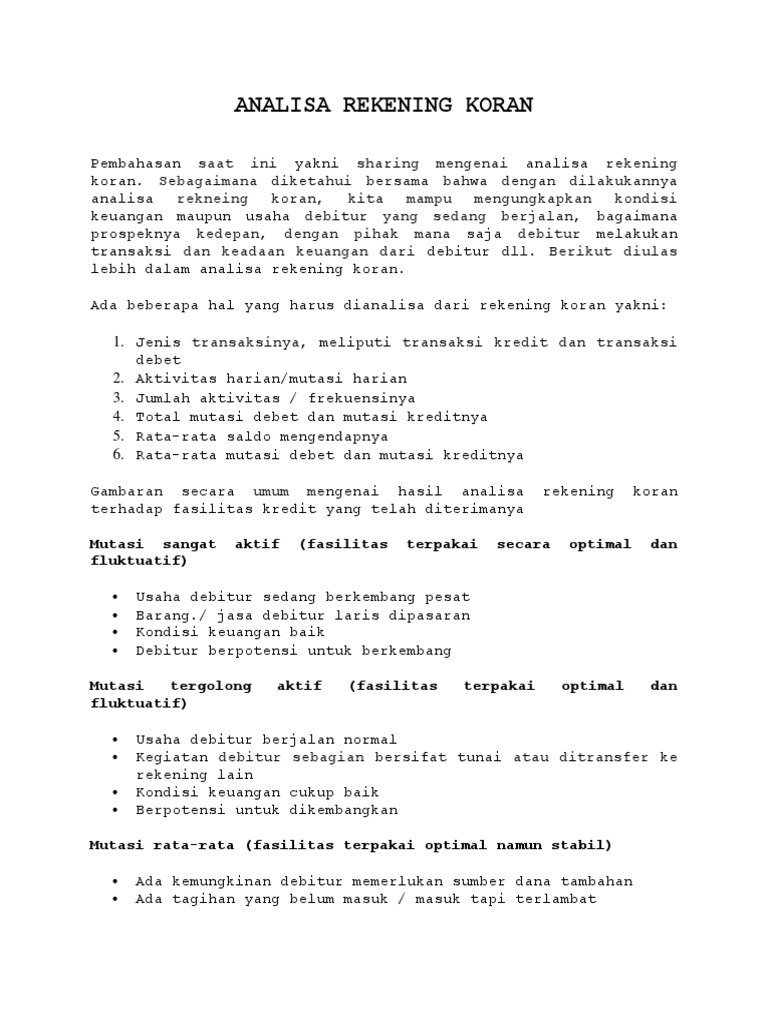 Cara cetak rekening koran Mandiri - Cermati.com Maka rekening koran dapat membuktikannya. 4. Mengajukan Pinjaman. BCA, BRI, BNI dan Mandiri menawarkan kemudahan akses bagi nasabahnya agar bisa mendapatkan mutasi rekening, print buku atau print laporan transaksi secara online. Pinjaman Rekening Koran BRI, Syarat dan Bunga 2022 Pinjaman Rekening Koran BRI - Berbeda dengan produk pinjaman yang ditawarkan oleh Bank BRI seperti KUR, Pinjaman PNS dan Kupedes, pinjaman rekening koran memiliki fleksibilitas dalam Sebagai contoh, pengajuan pinjaman rekening koran BRI anda telah disetujui dengan plafon 50 juta. Pinjaman Rekening Koran - PRK - YouTube Video ini adalah video kedua saya dan merupakan video pertama dari seri analisis kredit yang diambil dari materi training saya sebagai trainer analisis...