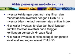 INVESTASI PADA ENTITAS ASOSIASI PSAK 15 Entitas asosiasi Investasi pada entitas asosiasi dicatat menggunakan metode ekuitas. Investor menghentikan penggunaan metode ekuitas sejak tanggal investor tidak lagi memiliki pengaruh signifikan. Ketika investasi dihentikan pada entitas asosiasi dan dicatat sesuai dengan PSAK 55 (instrumen keuangan pengakuan dan pengukuran). METODE EKUITAS
