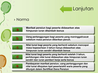 PDF Dana Pensiun - Ojk (4) Ketentuan sebagaimana dimaksud dalam ayat (1), ayat (2), dan ayat (3), diatur lebih lanjut dengan Peraturan Pemerintah. Pasal 18 (1) Besarnya iuran peserta Dana Pensiun yang menyelenggarakan Program Pensiun Manfaat Pasti Mengenal Dana Pensiun: Manfaat yang Diterima dan ... Dana Pensiun adalah lembaga yang mengelola dan menjalankan program manfaat pensiun. Manfaat pensiun adalah pembayaran berkala yang dibayarkan kepada pekerja penerima pensiun pada saat usia pensiun dan dengan cara yang ditetapkan dalam peraturan Dana Pensiun. Dana Pensiun diatur dalam UU No 11 tahun 1992. Kita mengenal 2 jenis dana pensiun, yaitu:
