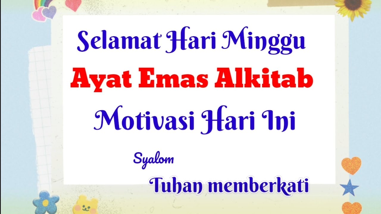 20 Ayat Alkitab Tentang Hari Minggu Terbaik untuk Ibadah ... Ayat-ayat emas Alkitab ini selain bisa menjadi materi ibadah yang menarik, juga bisa dimanfaatkan sebagai bahan renungan saat teduh untuk memaknai hari yang penuh berkat dari Tuhan ini. Pada kesempatan ini, kami akan membagikan kumpulan ayat emas Alkitab atau firman Tuhan tentang hari minggu terbaik, terlengkap, dan dirangkum dari berbagai sumber.