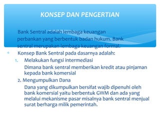 Pengantar Kebanksentralan Teori dan Kebijakan - Bank Indonesia adapun aspek-aspek yang disempurnakan dalam buku ini antara lain mencakup perkembangan kelembagaan bank sentral, perkembangan kebijakan moneter dan operasionalnya, perkembangan lembaga keuangan, stabilitas sistem keuangan dan sistem perbankan syariah dan perkembangan yang terjadi di bidang sistem pembayaran serta perkembangan organisasi bank … Bank Sentral : Pengertian, Tujuan, Peran, Tugas, Fungsi ... Bank Sentral ialah sebuah badan keuangan, yang pada umumnya dipunyai pemerintah, serta menjamin supaya kegiatan badan-badan keuangan tersebut bisa menciptakan tingkat kegiatan ekonomi yang tinggi dan stabil. Bank sentral di Indonesia yaitu Bank Indonesia (BI). Menurut UU RI NO.3 Tahun 2004 Tentang perubahan atas UU.