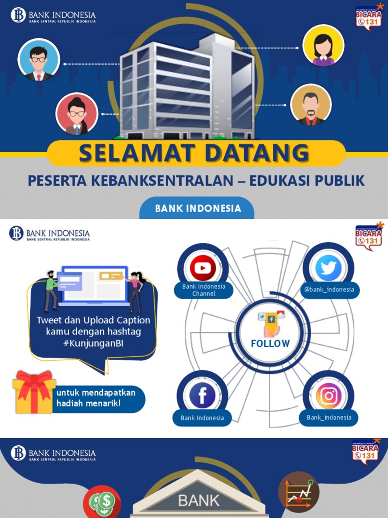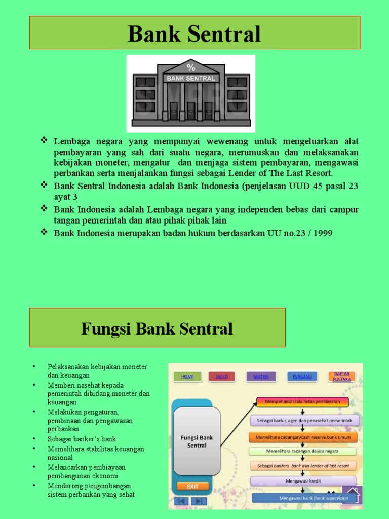 Materi kebanksentralan bank indonesia. (PPT) Materi Kebanksentralan Bedah Buku | Feby Pricilia ... • Sebagai otoritas moneter, kebijakan bank sentral sangat berpengaruh terhadap seluruh kegiatan ekonomi suatu negara. • Dalam hal bank sentral berfungsi sebagai pengawas bank dan sebagai pengatur lalu lintas pembayaran, bank sentral juga sangat vital dalam menjaga stabilitas sistem keuangan. Materi Kebanksentralan - SPEKTRO BI Bank Indonesia . Building D 10th Floor, Bank Indonesia Institute. Learning Innovation and Partnership Team. Jl. MH Thamrin no. 2, Central Jakarta. Phone No : +6221 - 29810000 ext.2167 TIPS PENGALAMAN REKRUTMEN BANK INDONESIA / PCPM 31 - Blogger TIPS PENGALAMAN REKRUTMEN BANK INDONESIA / PCPM 31. TIPS PENGALAMAN REKRUTMEN TELKOM, REKRUTMEN BANK INDONESIA dan REKRUTMEN OTORITAS JASA KEUANGAN ( OJK) PART III. Pihak penyelenggara EXPERD. Sejak dahulu cita-cita saya adalah masuk ke instansi ini ,oleh karena itu sejak awal saya sudah rajin melihat-lihat peluang lowongan PCPM Bank Indonesia. Ekonomi X BAB 6 Bank Sentral, Sistem Pembayaran dan Alat ... Bank sentral di Indonesia dipegang oleh Bank Indonesia. Menurut UU Nomor 23 Tahun 1999 sebagaimana diubah menajdi UU Nomor 3 tahun 2004 tentang Bank Indonesia, Bank Indonesia merupakan lembaga negara yang independen dalam melaksanakan tugas dan wewenangnya bebas dari campur tangan pemerintah dan atau pihak-pihak lainnya, kecuali untuk hal-hal yang secara tegas diatur dalam undang-undang tersebut.