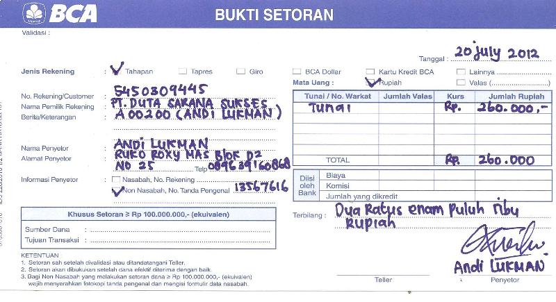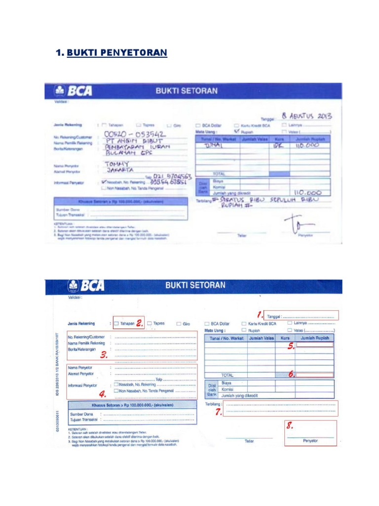 (DOC) Contoh Bukti Transaksi Pembayaran Perusahaan ... Bukti Setoran Bank Sebuah catatan transaksi yang disediakan dari pihak bank unntuk digunakan pada saat atau pada saat melakukan setoran yang ke bank. Apabila timbul sebuah kesalahan pencatatan, adanya bukti ini sangat dibutuhkan saat akan membuat rekonsiliasi bank, dianjurkan agar bukti ini disimpan agar tidak hilang.