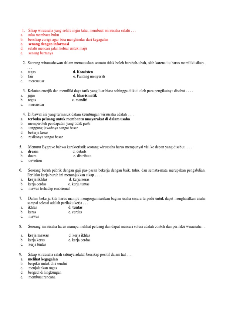 50+ Contoh soal kewirausahaan beserta jawabannya 1. Yang bukan salah satu penyebab kegagalan seorang pelaku bisnis dalam menjalankan usahanya adalah …. a. Kurang modal b. Manager tidak kompeten c. Lokasi kurang strategis d. Pemasaran kurang e. Kemampuan leadership 2. Di bawah ini yang termasuk ketrampilan dasar yang harus dimiliki seoorang wirausahawan adalah……