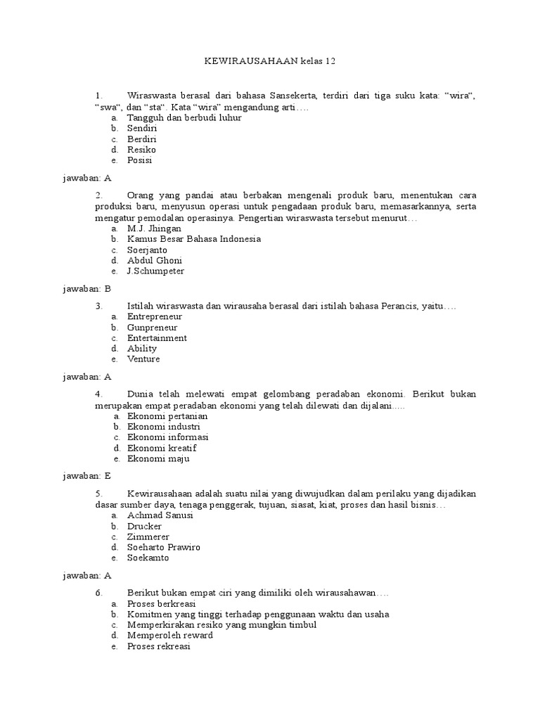 Soal Latihan Kewirausahaan Kelas 10 Beserta ... - PRAKATA Kita Soal Latihan Kewirausahaan Kelas 10 Beserta Jawabannya PG dan Essay. Ilmu adalah pengetahuan yang telah disusun secara sistematis dan berlaku umum, sedangkan pengetahuan adalah pengalaman yang bersifat pribadi/kelompok dan belum disusun secara sistematis karena belum dicoba dan diuji. Dalam konteks akademis atau profesional, ujian (atau ujian ... Yang bukan salah satu penyebab gagalnya seorang pelaku ... PAS Sosiologi SMA Kelas 11. Fiqih MA Kelas 10. Cara Menggunakan : Baca dan cermati soal baik-baik, lalu pilih salah satu jawaban yang kamu anggap benar dengan mengklik / tap pilihan yang tersedia. Tips : Jika halaman ini selalu menampilkan soal yang sama secara beruntun, maka pastikan kamu mengoreksi soal terlebih dahulu dengan menekan tombol ... 6 Faktor Penyebab Kegagalan Dalam Bisnis Dan Usaha #4 Melakukan kerjasama dengan orang yang salah Berikutnya yang dapat menjadi pemicu atau salah satu faktor penyebab kegagalan dalam berbisnis dan usaha adalah melakukan bentuk kerjasama dengan orang yang salah.